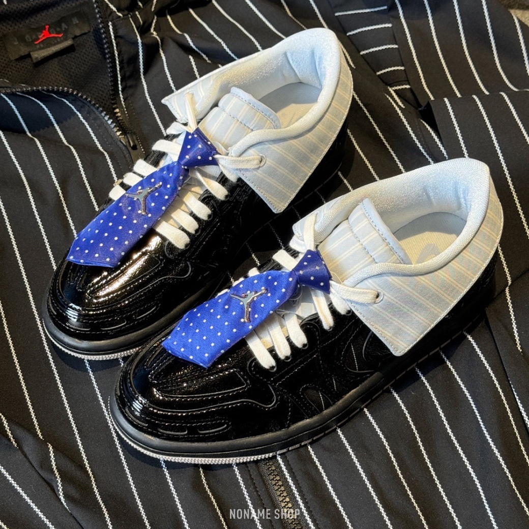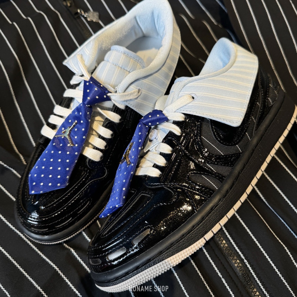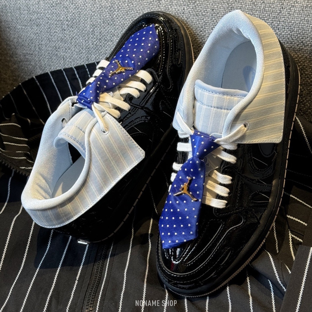 🔹漆皮鞋面搭配藍色領帶