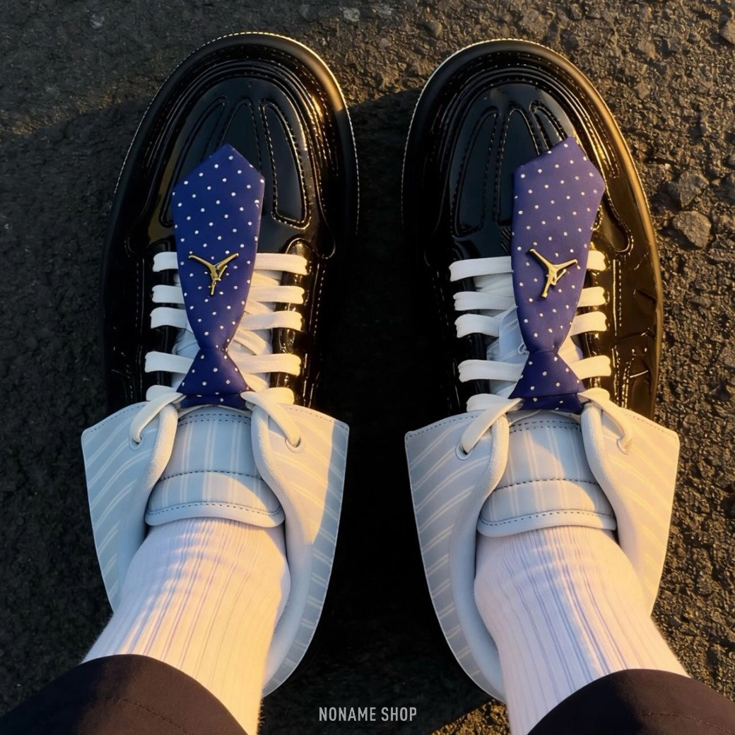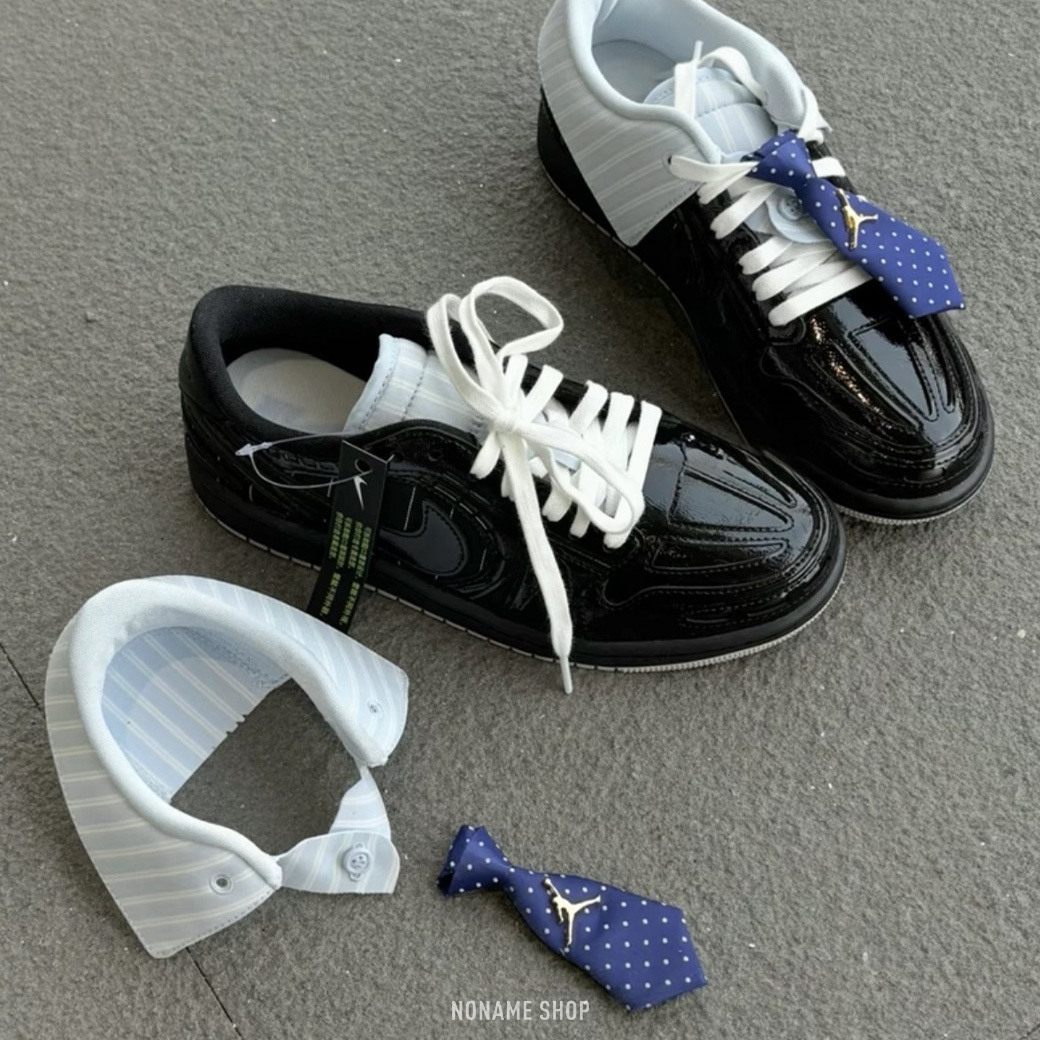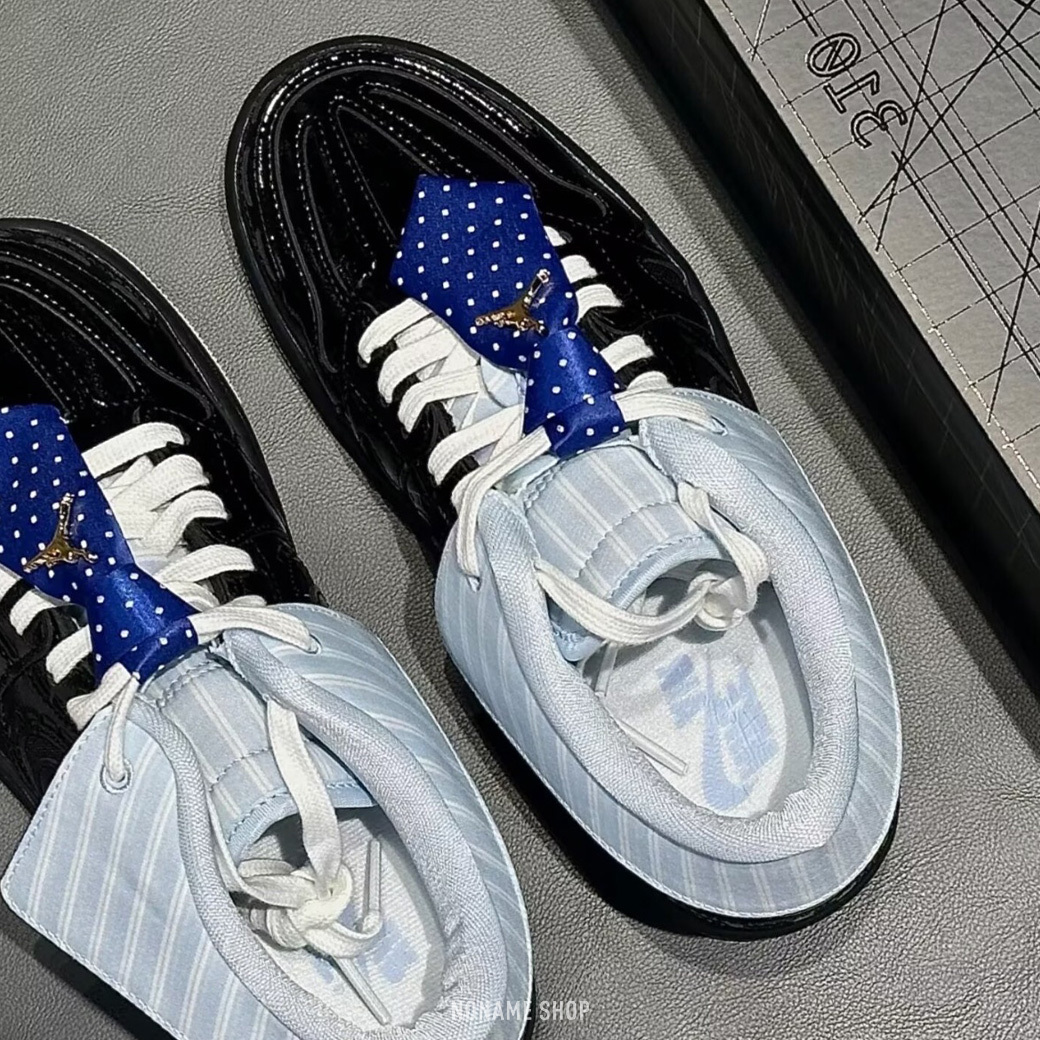 🔹漆皮鞋面搭配藍色領帶